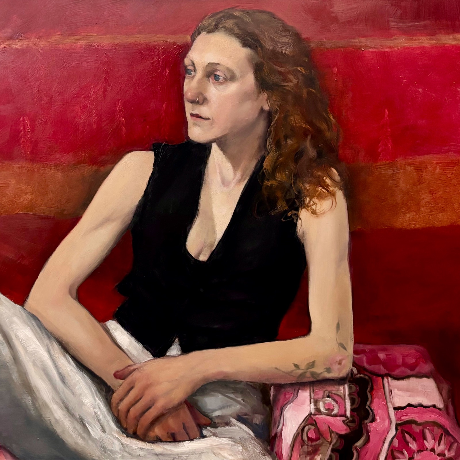 The following image shows initial development of this portrait. Many changes came after this stage. Because this painting is completed from a live model, I adjust her pose and color constantly until I am satisfied with how the entire figure works with the composition.